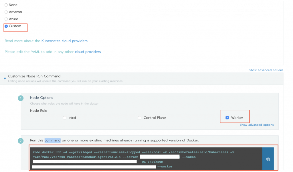 Once Custom is selected copy and save the registration command used to add new workers to the cluster. This will be used later to build the instance userData.